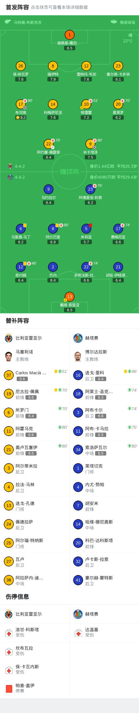 北京时间12月6日,西班牙足球甲级联赛第15轮,比利亚雷亚尔坐镇主场迎战赫塔费。上半场补时阶段,阿约塞-佩雷斯送出助攻,布坎南破门得分,为球队取得领先。易边再战,赫塔费球员米利亚被红牌罚下,球队陷入人数劣势。随后,比利亚雷亚尔由米卡塔泽再下一城,扩大比分优势。最终,比利亚雷亚尔以2比0战胜赫塔费,全取三分。