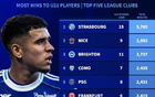 五大联赛球队本赛季U21球员出场时间:巴黎、切尔西、皇马上榜